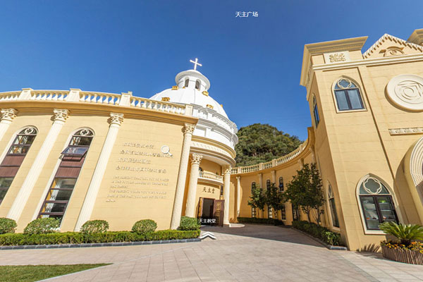 天主教堂融合了梵蒂岡文藝復興時期風格和歐羅巴建筑風格,整體建筑莊嚴、神圣,以歐式宗教元素為依托,采用大量古典柱式裝飾,內(nèi)有彩繪玻璃窗點綴。